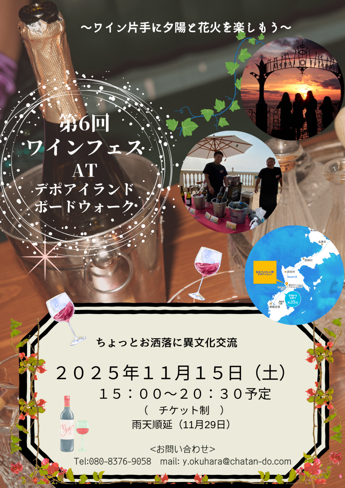 2025.10.26 第6回ワインフェスin デポアイランド 沖縄でも秋風を感じる11月15日、デポアイランドでワインフェス開催です。大人が楽しむワインフェスで秋を楽しんでくださいね。#ワインフェス #デポアイランド #ボードウォーク #北谷DMO #お酒は20歳になってから #北谷イベント #北谷観光 #美國村 #北谷町 #沖縄