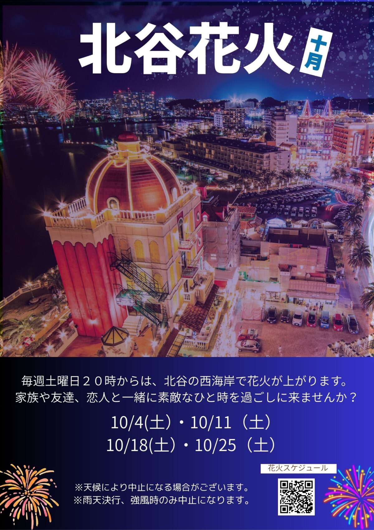 まだまだ暑さの続く北谷ですが、土曜の夜は花火を見ながら夜散歩で涼んでね。