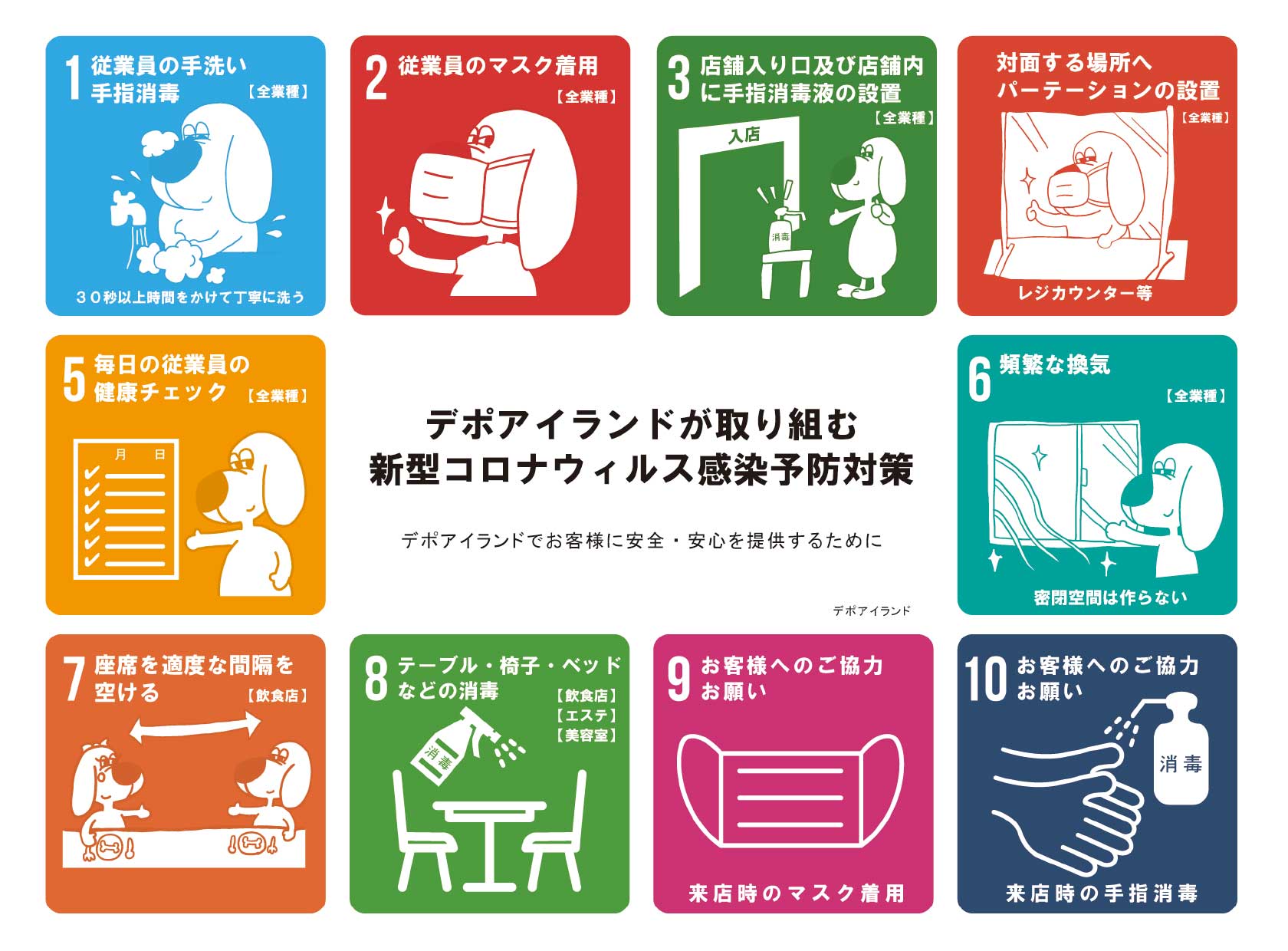 2020.08.03 【お知らせ】デポアイランドにおける新型コロナウィルス感染拡大予防対策について お知らせ デポアイランドにおける 新型コロナウィルス感染予防対策について 平素よりご愛顧賜り誠にありがとうございます。 新型コロナウィルス感染拡大防止対策において、デポアイランドでは地域・テナント・来訪者と共に感染予防に取り組みたいと考えております。 お客様にはご不便をおかけ致しますが、ご理解、ご協力くださいますようお願い申し上げます。 ▲ダウンロード デポアイランドでお客様に安全・安心を提供するために 対策に取り組むと共にご協力をお願いしております。 ▲ダウンロード 1.デポアイランドの対策事例 —— 2.ソーホーの対策事例