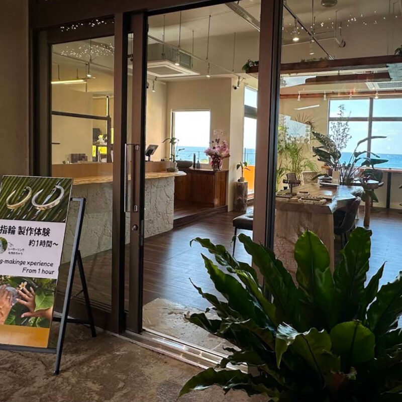 美しい沖縄の海が見渡せるオーシャンビューのカウンター席で、リラックスしながら楽しい思いのこもったジュエリーを作って頂き、ふとお手元を見た時にその楽しかった沖縄での時間を思い出したり、背中を押されるお守りの様な存在になって欲しいと願いながら、お客様と一緒になって私達も楽しくジュエリー制作をさせて頂いております。