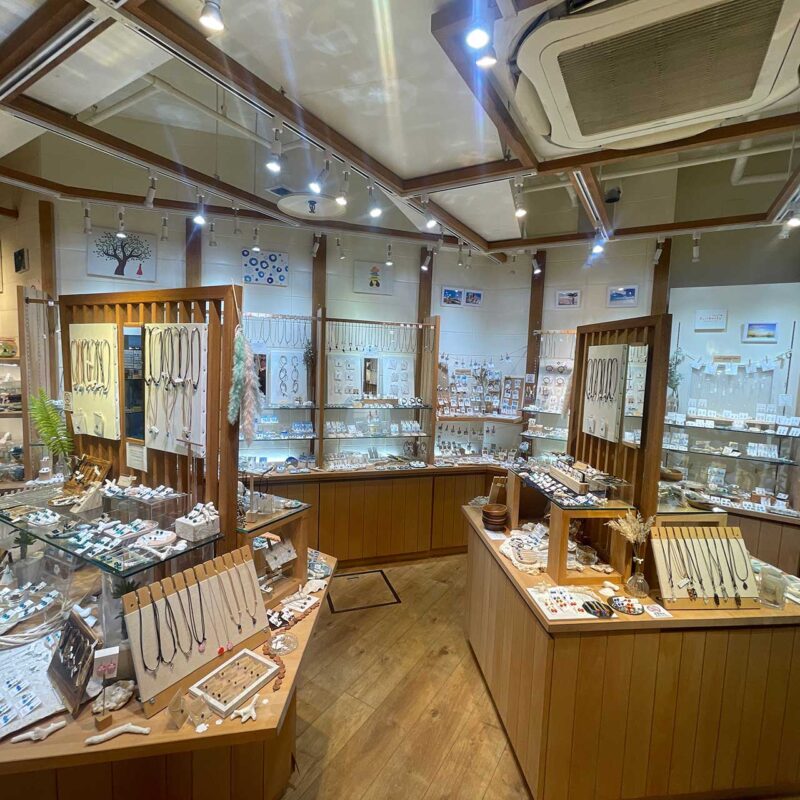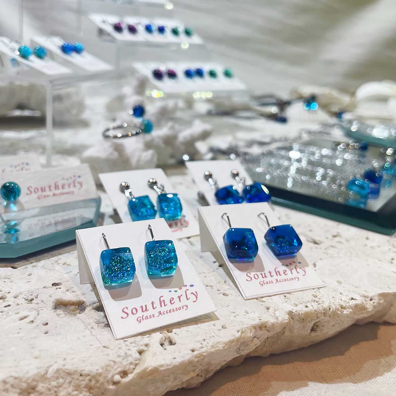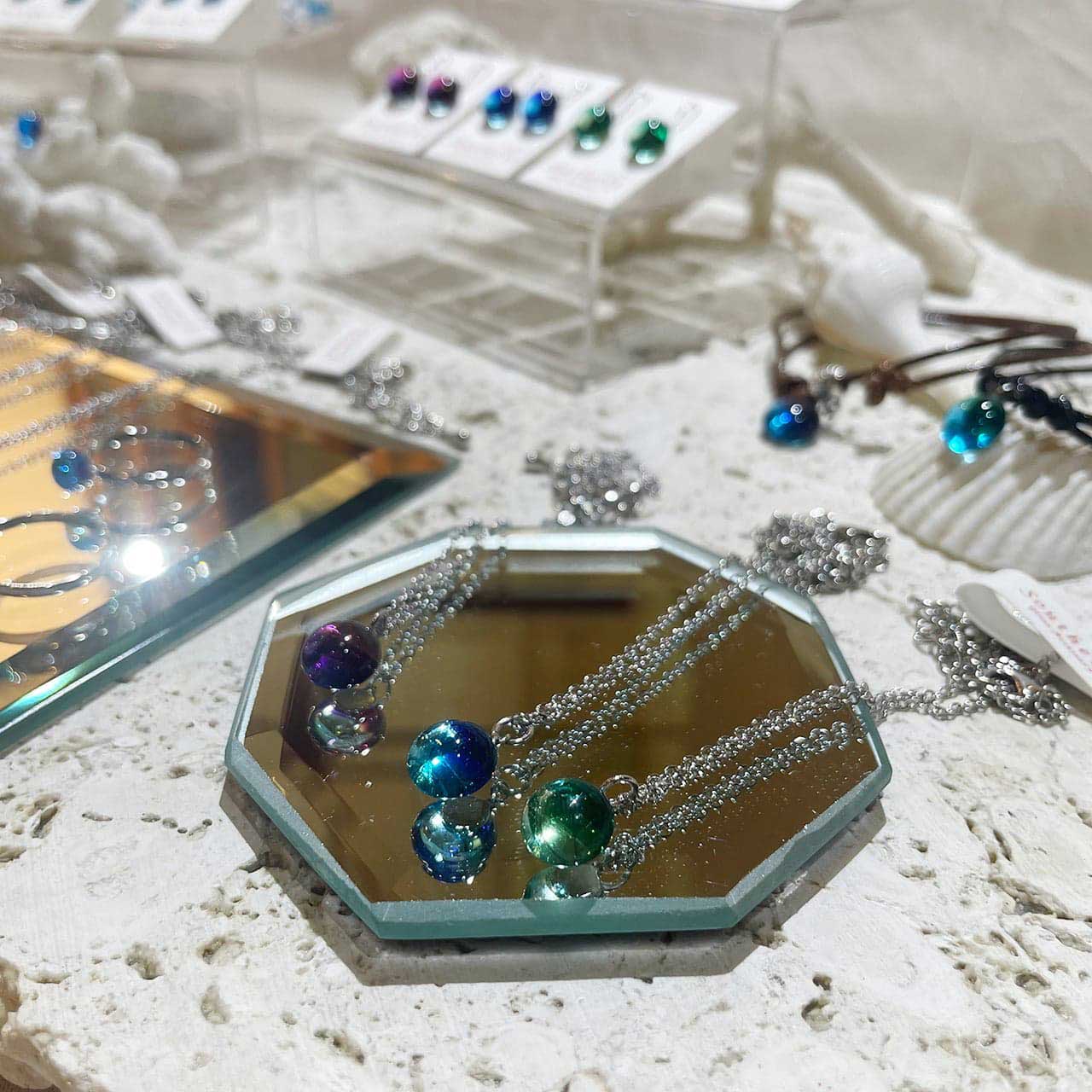 美しい海と空にインスピレーションを得て店内の工房で制作したオリジナルデザインのネックレスやピアスさりげなく身に着けられるガラスアクセサリーをお届けします。
