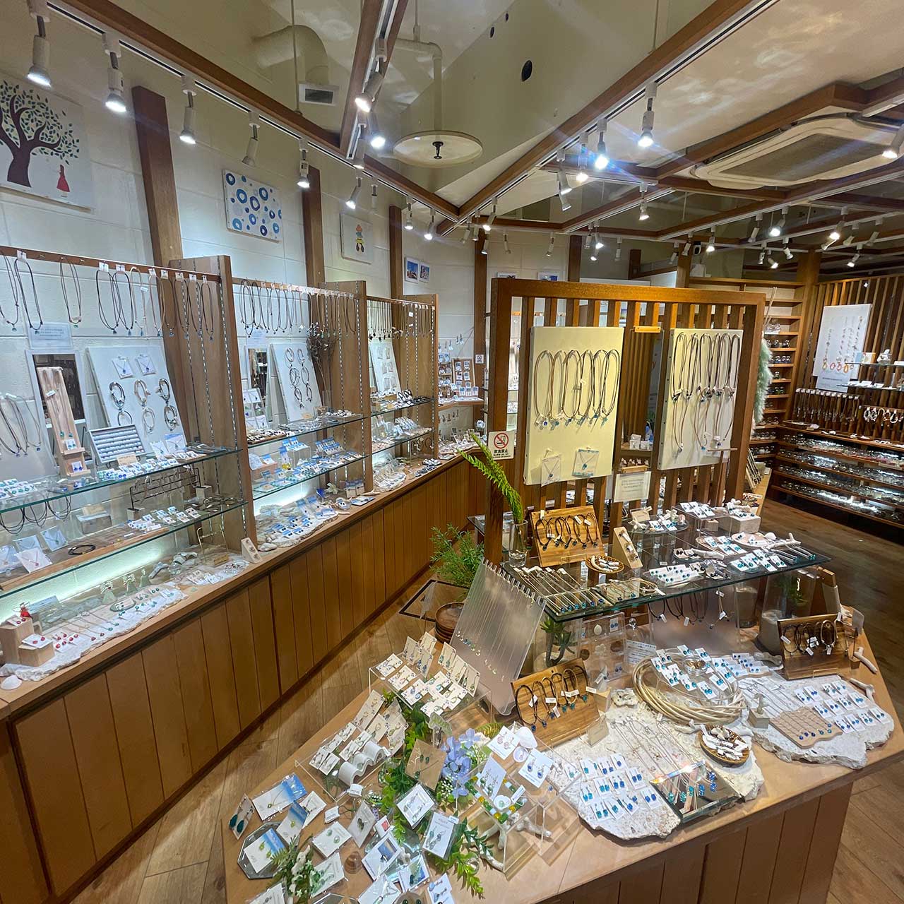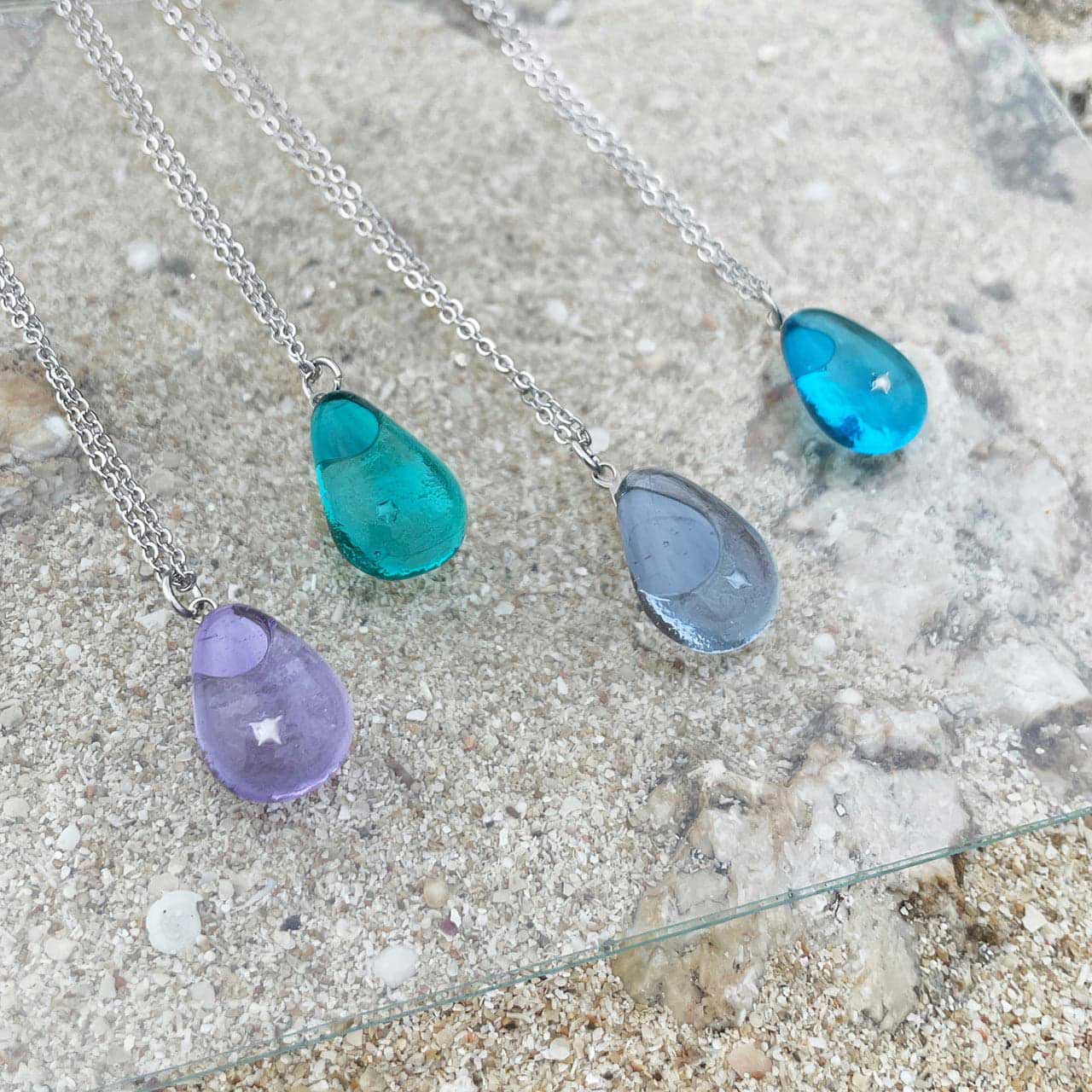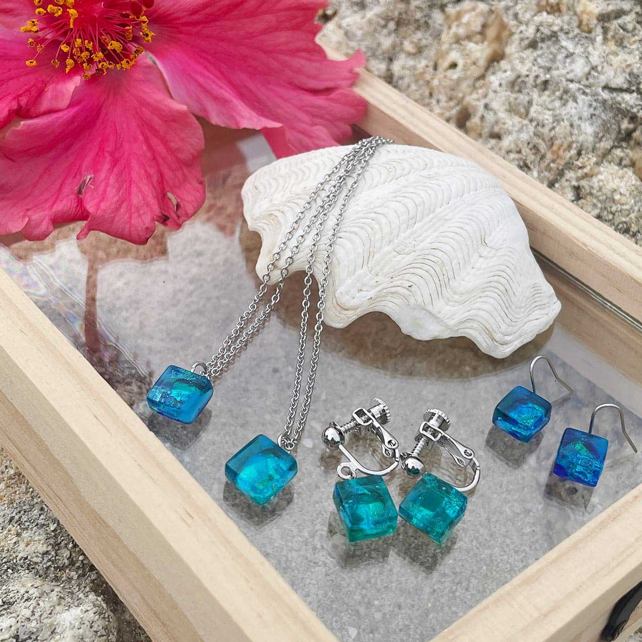 美しい海と空にインスピレーションを得て店内の工房で制作したオリジナルデザインのネックレスやピアスさりげなく身に着けられるガラスアクセサリーをお届けします。